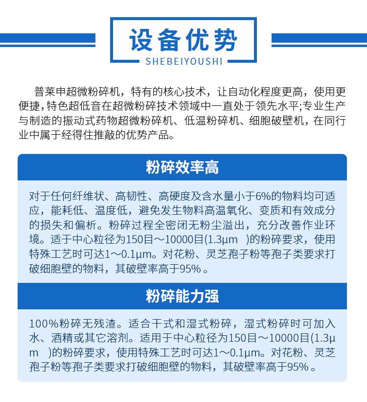 4.對花粉及其它孢子植物等要求打破細胞壁的物料,其破壁率高于95%。適于中心粒徑為150目-2000目(5pm)的粉碎要求。有些物料使用特殊工藝時(shí),可達0.1pm。同時(shí)適應干式和濕式粉碎。濕式粉碎時(shí)可加入水、酒精或其他液體。