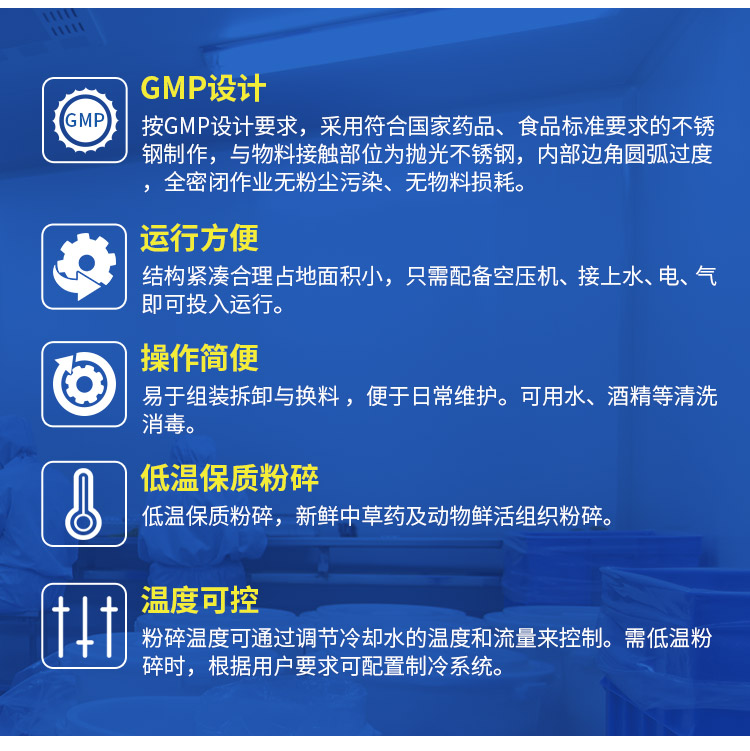 普萊申黃芪中藥超微粉碎機系列采用雙桶投料,全自動(dòng)翻轉進(jìn)料,更省心省力,負壓密封設計,噪音低,干凈安全。同時(shí)采用低溫粉碎技術(shù),保存了物料活性成分,機器采用一體化設計,節省空間,更節能,研磨粉碎方式,可連續工作16小時(shí)。目前采用的是先進(jìn)的數控屏幕,操作清晰便捷,操作過(guò)程效率高,耗能低,不易損壞。