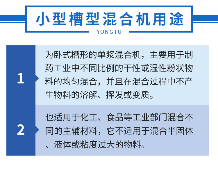 2、也適用于化工、食品等工業(yè)部門(mén)混合不同的主輔材料,它不適用于混合半固體、液體或粘度過(guò)大的物料。